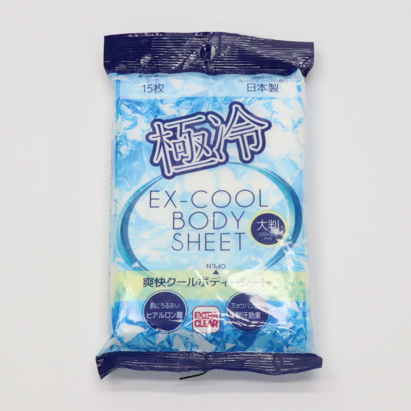こちらの商品は、すぐに冷たさを実感できる爽快クールボディシート15枚入りです。